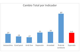 El siguiente paso fue conocer las mejoras según las áreas en las que se manifiestan los beneficios del taller. Los resultados indican que el mayor beneficio se dio en la disminución de conductas problemáticas (valor de .87), seguido por una disminución en ansiedad social (lo cual favorece una mejor interacción social) y mejora en síntomas de depresión. El resultado fue similar para hombres y mujeres en cuanto a las áreas con mayores cambios, pero con más impacto en los hombres. Por ejemplo, el cambio en conducta en hombres fue de .98, y para mujeres de .74; ansiedad social .41 en hombres y .25 mujeres, y .31 para depresión en hombres y .3 para mujeres.